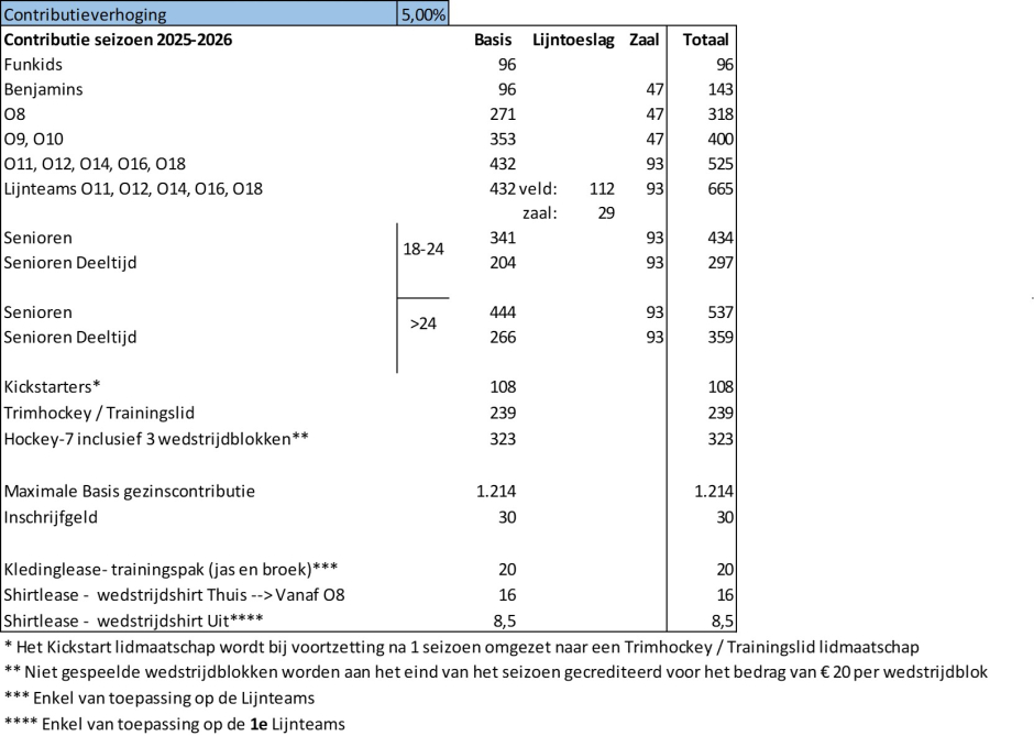 De leeftijd is bepalend voor de hoogte van de contributie ongeacht het team waarin gespeeld wordt.